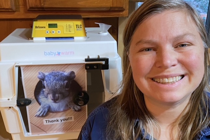 Amy says that seeing a baby animal in distress and not knowing how to best assist is one of the hardest things to process. Years ago she helped a duck that was in horrible shape and that led her to meet her first wildlife rehabilitator. The rehabber opened Amy's eyes to the knowledge and passion of individuals charged with the care for wildlife that are most in need, in spite of limited resources. Amy volunteered with wildlife rehabbers for over 25 years and for the last 2 years she has been licensed as Master Wildlife Rehabilitator. This year her focus is on squirrels; however, she also helps with other small mammal rescues.This incubator will be crucial in providing the life saving warmth for babies that come into her care.